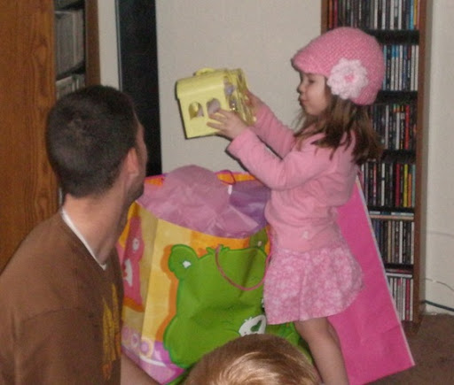 Then it was time for the party and Super Bowl on Sunday. I'd asked my daughter if she wanted to watch football for her birthday, and the answer was yes. So we had snacky foods (she wanted summer sausage for her birthday) and chocolate cake, with chocolate frosting. Here's a pic of her with her new hat she'd requested. I modified the request a bit, but she really enjoys it all the same.